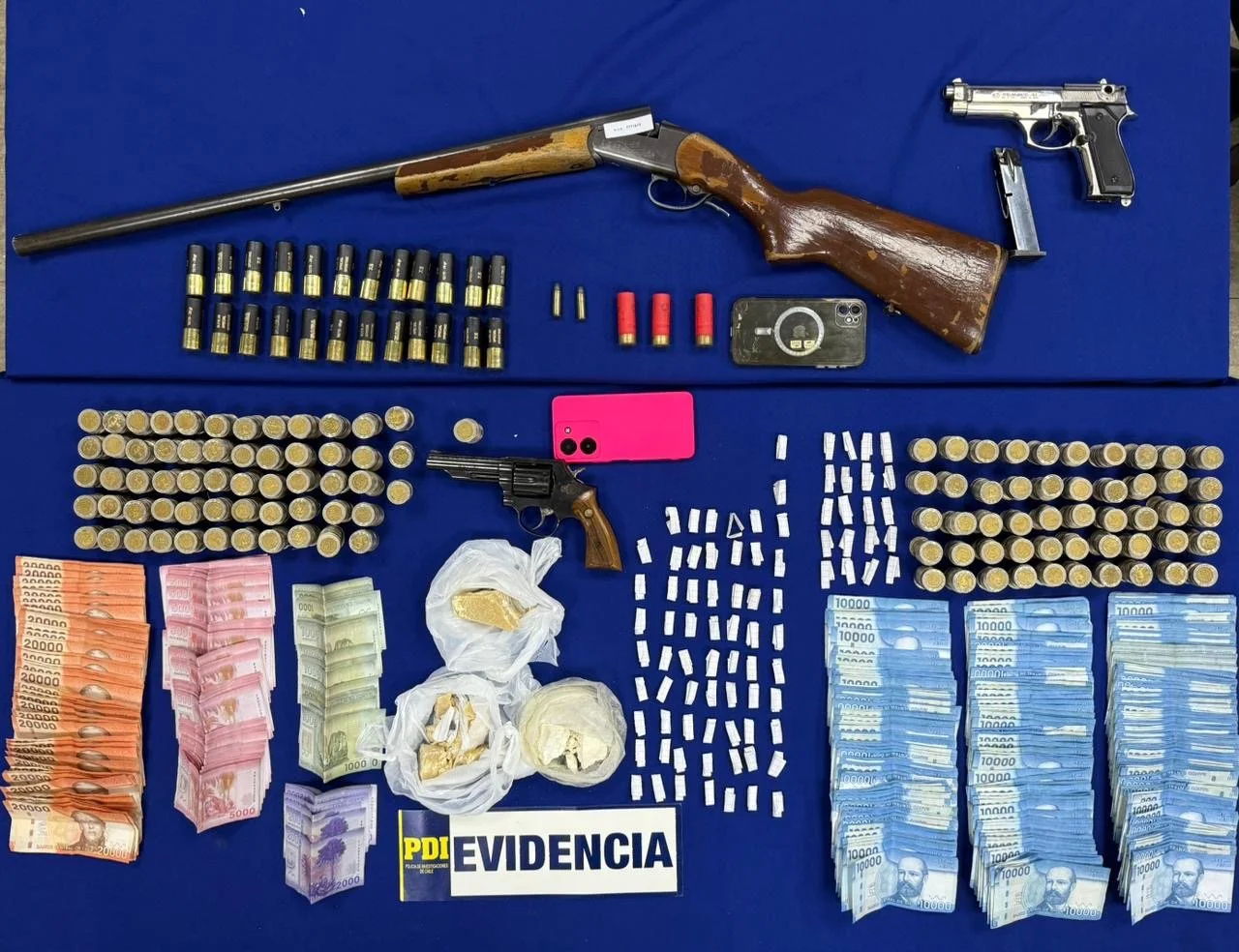 Precisamente, en esta última casa, la PDI incautó 250 gramos de pasta base, un revólver, un arma de fogueo, municiones y más de 6 millones de pesos producto del comercio ilegal de sustancias ilícitas. En otros inmuebles, se incautaron una escopeta, más municiones y más droga.