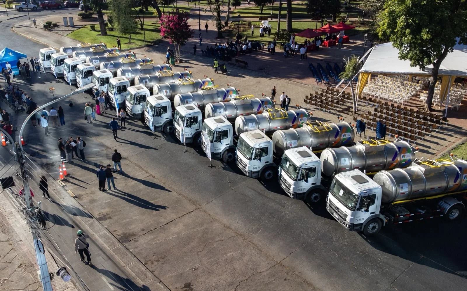Ya están en Ñuble 13 nuevos camiones aljibe, la primera parte de un total de 69 vehículos y maquinarias que entregará a las 21 comunas el Gobierno Regional, a través de una inversión histórica cercana a los $12 mil millones. A primera hora de esta mañana, en una ceremonia junto a los alcaldes, representantes municipales y consejeros regionales, el Gobernador Óscar Crisóstomo dio el vamos para su llegada a los territorios que los sumarán a su flota: Ránquil, Cobquecura, Ninhue, San Nicolás, Ñiquén, Trehuaco, Bulnes, San Carlos, Chillán, Quillón, Portezuelo, Pinto y San Ignacio.