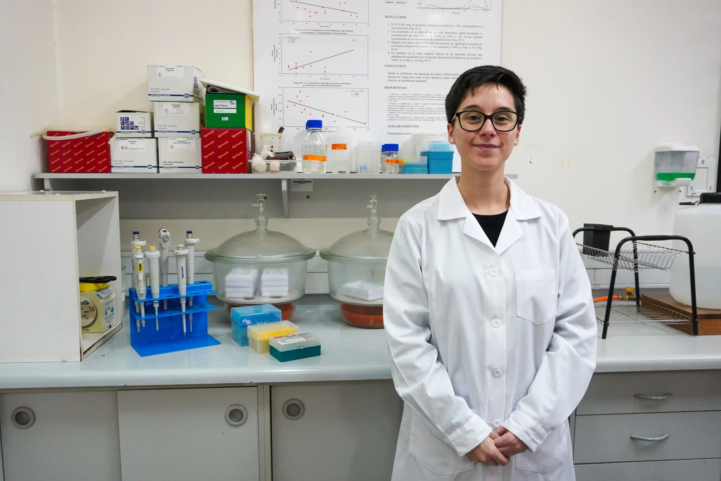Uno de sus estudios, financiado por la Dirección de Investigación de la UCSC (DIREG 06/2024), busca un método rápido y no invasivo de diagnóstico de endometriosis mediante el análisis químico-analítico de muestras de sangre u orina. Los datos obtenidos se procesarán con algoritmos de inteligencia artificial para diferenciar entre mujeres con y sin la enfermedad, ofreciendo una alternativa a la laparoscopía, que hoy es el método de referencia y requiere intervención quirúrgica.