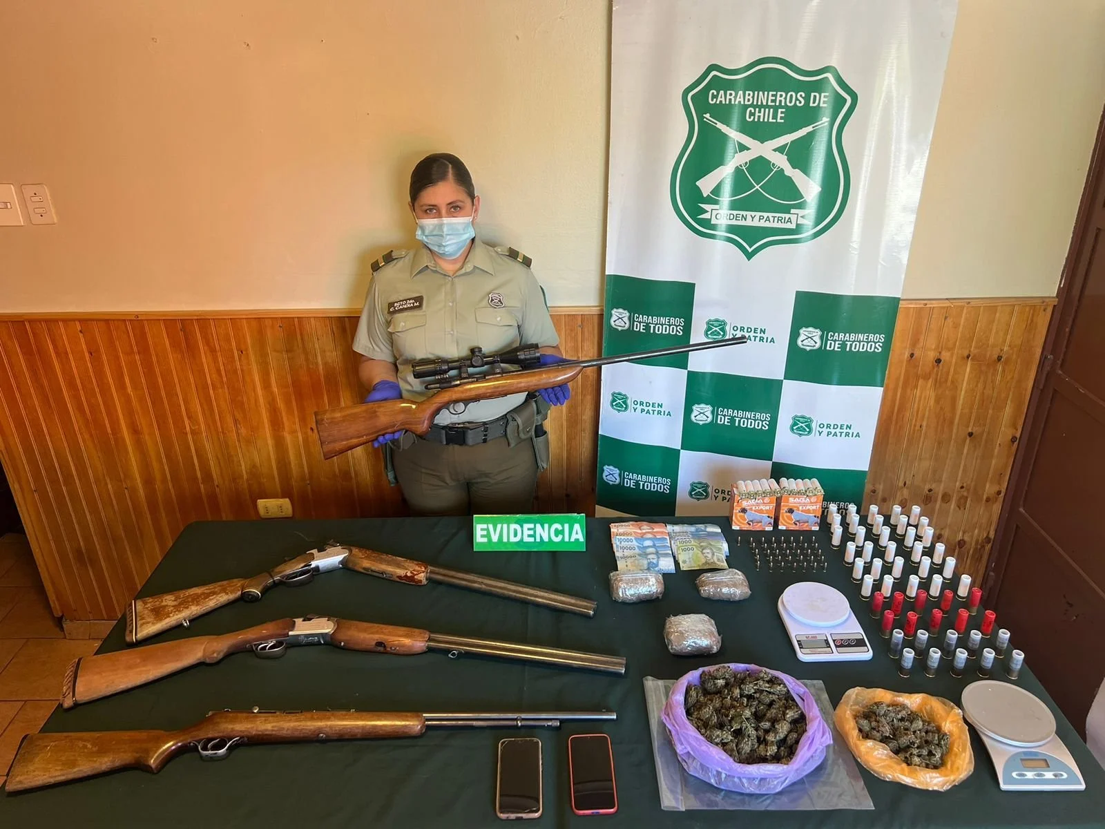 En los domicilios intervenidos, el personal policial especializado logró la incautación de 346 Gramos de Marihuana Elaborada, 828 Gramos de Cafeína, 2 escopetas calibre 12, 2 Rifles Calibre .22, 104 Cartuchos de Escopeta Calibre 12, 36 Cartuchos Calibre 22, 2 Teléfonos Celulares, $154.000 dinero en efectivo y 02 Pesas Digitales.