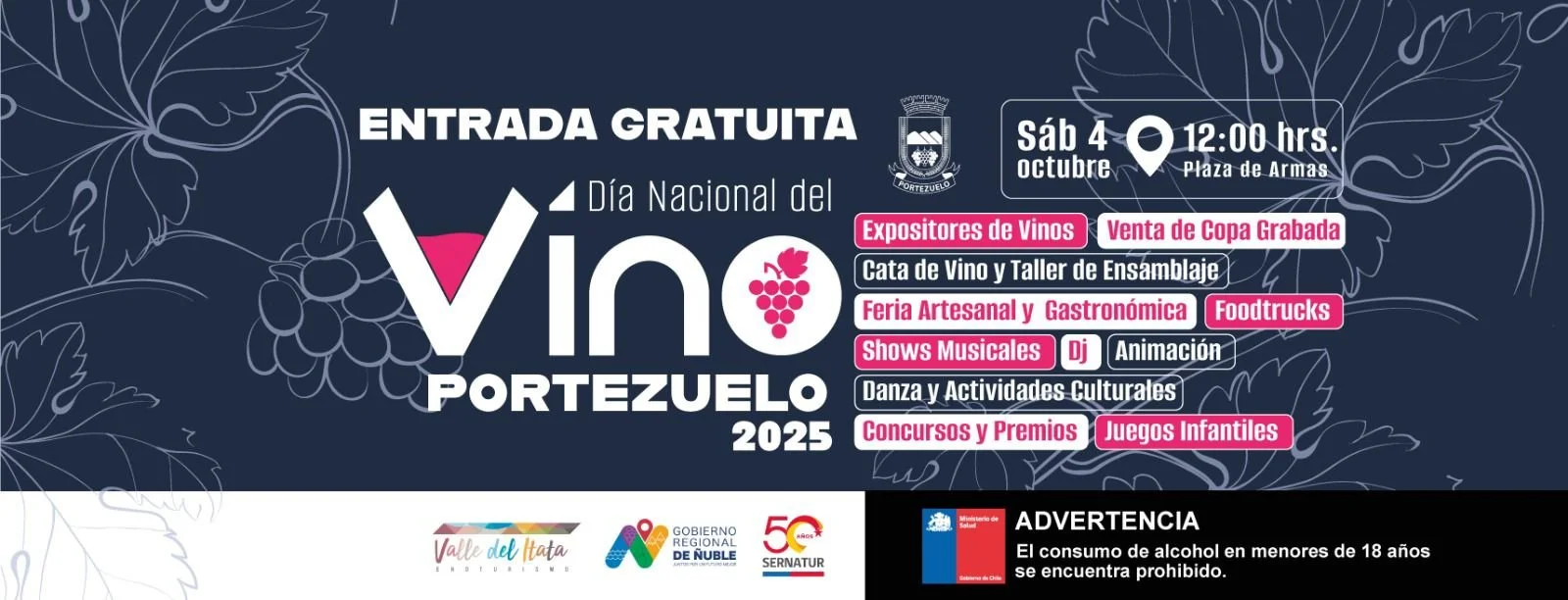 El próximo sábado 4 de octubre, la comuna de Portezuelo se transformará en el epicentro de las celebraciones del Día Nacional del Vino, con un evento que reunirá a más de 90 expositores y 13 viñas locales. La actividad, que se realizará en la Plaza de Portezuelo, es un homenaje al legado patrimonial y cultural de la comuna, reconocida históricamente como la cuna donde nace el vino chileno.
