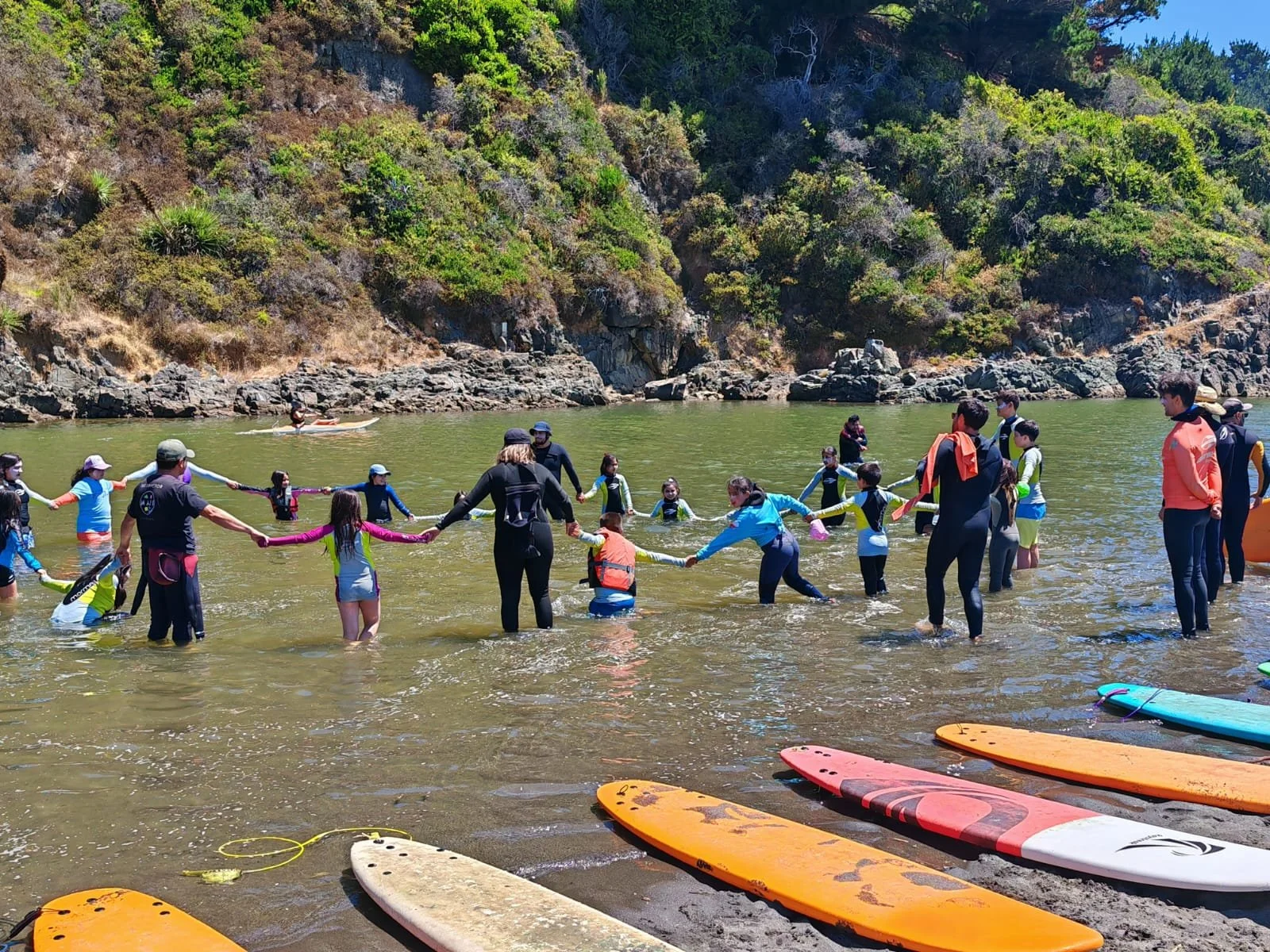 Es así que, en la comuna de Cobquecura, a orillas de la desembocadura de playa La Boca, 30 niñas y niños se encuentran practicando Surf, con instructores, implementación, alimentación y gran entusiasmo.